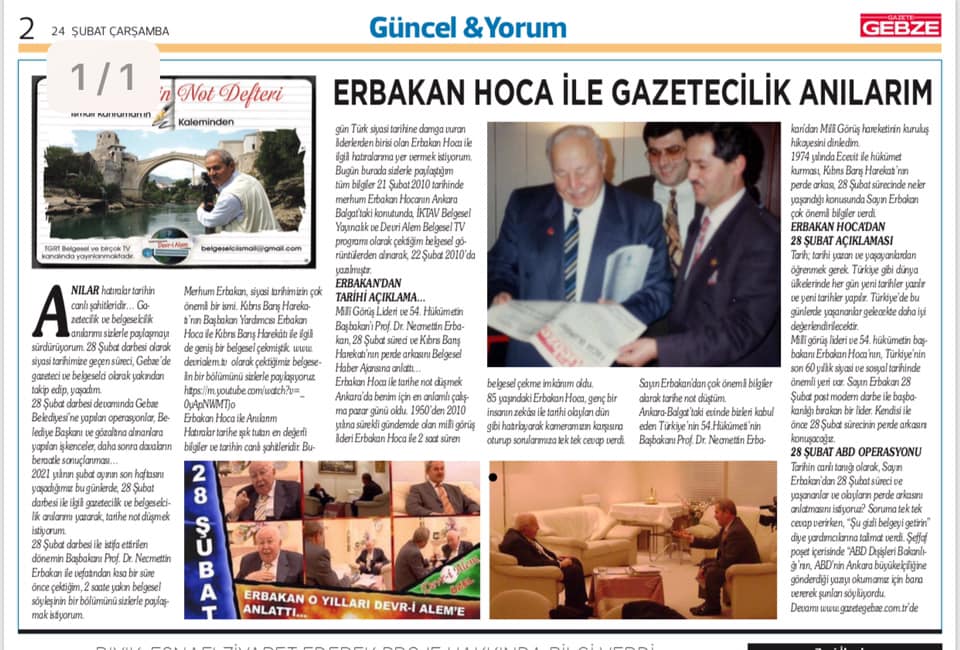 Anılar hatıralar tarihin canlı şahitleridir… Gazetecilik ve belgeselcilik anılarımı sizlerle paylaşmayı sürdürüyorum. 28 Şubat darbesi olarak siyasi tarihimize geçen süreci, Gebze’de gazeteci ve belgeselci olarak yakından takip edip, yaşadım.