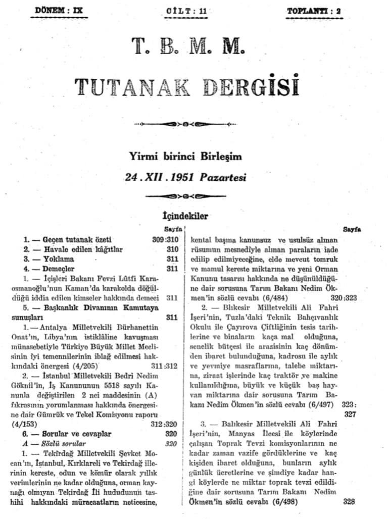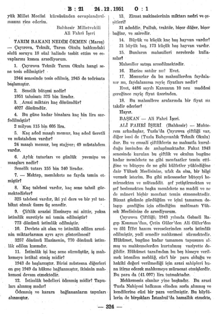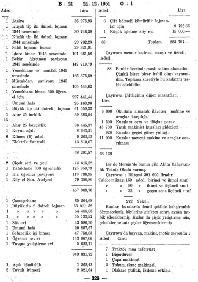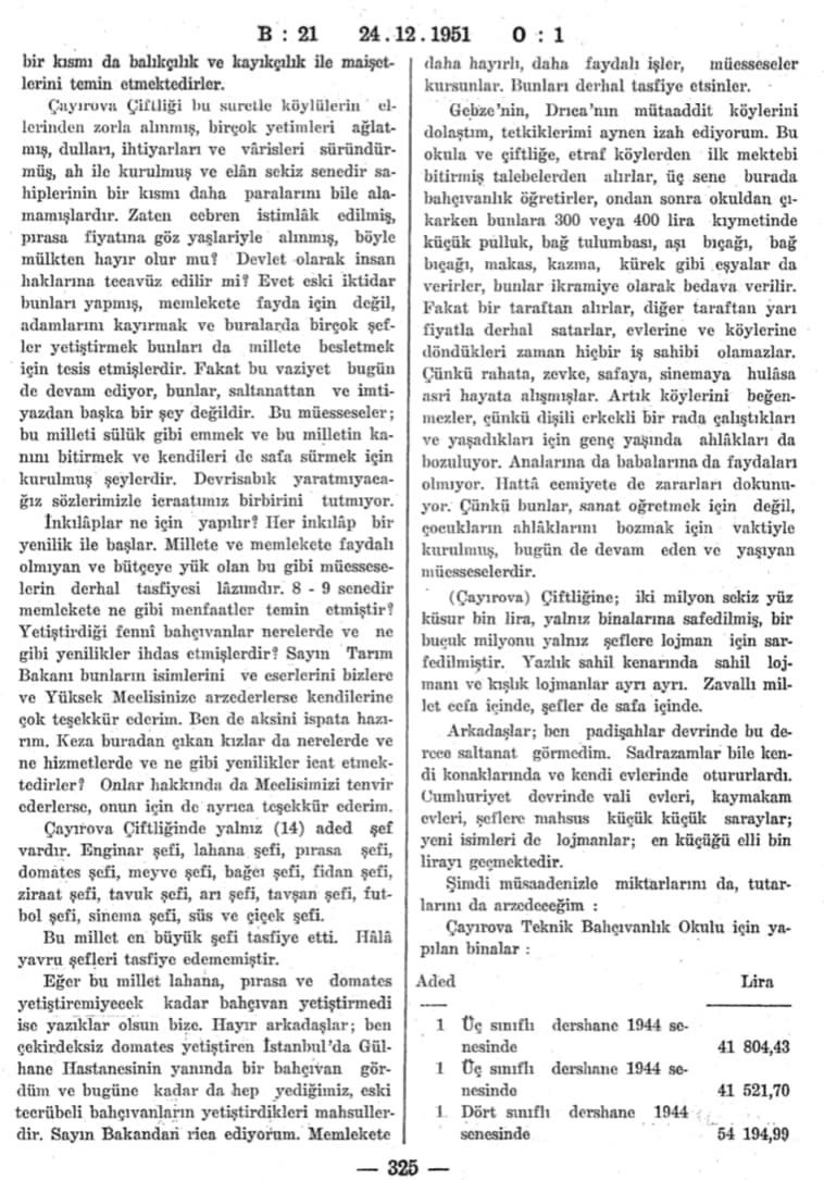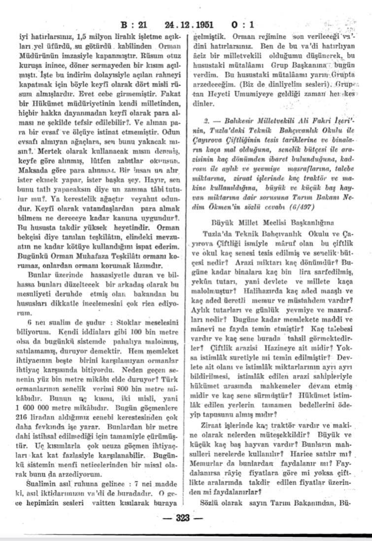 GEBZE TEKNİK ÜNİVERSİTESİ'NİN BULUNDUĞU BÖLGEDE 1943 YILINDA KURULAN ÇAYIROVA TEKNİK BAHÇIVANLIK OKULU İLE İLGİLİ 1951 YILINDA YAYINLANAN TÜRKİYE BÜYÜK MİLLET MECLİSİ TUTANAK DERGİSİNDE YER ALAN ÇOK ÖNEMLİ BELGE VE BİLGİLERİ YAYINLIYORUZ.