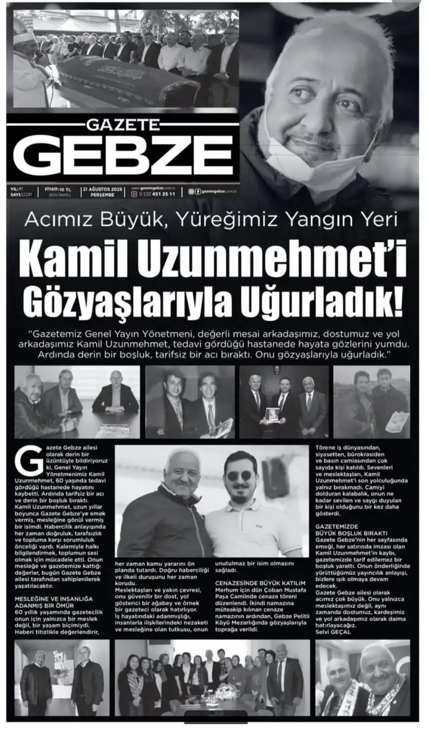 Kardeş gazetemiz GAZETE GEBZE Nin Genel Yayın Yönetmeni, 40 yıllık arkadaşım dostum mesleğine aşık üreten mesleğine değer katmaya çalışan Kamil Uzunmehmet’i kaybetmenin derin acı ve üzüntüsü içindeyim