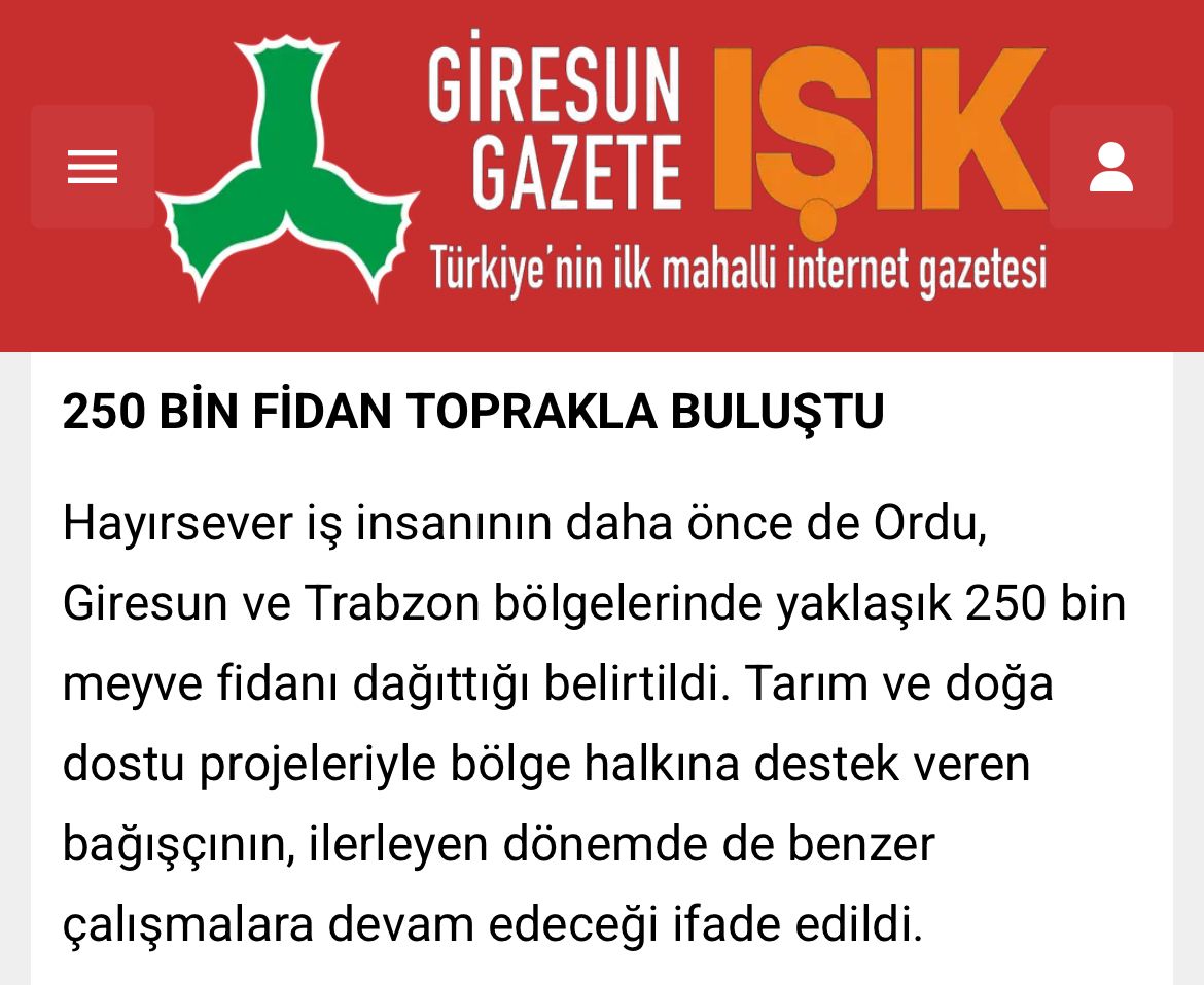 Giresun'un Bulancak ve Piraziz ilçelerinde 2025 yılı Ramazan ayında toplamda 24 bin meyve fidanı, İstanbul'da oyuncak işiyle tanınan Kayserili iş insanı Necati Uçar'ın bağışıyla vatandaşlara teslim edilmesi ile ilgili Gebze gazetesi haber sitesinde yayınlan haber