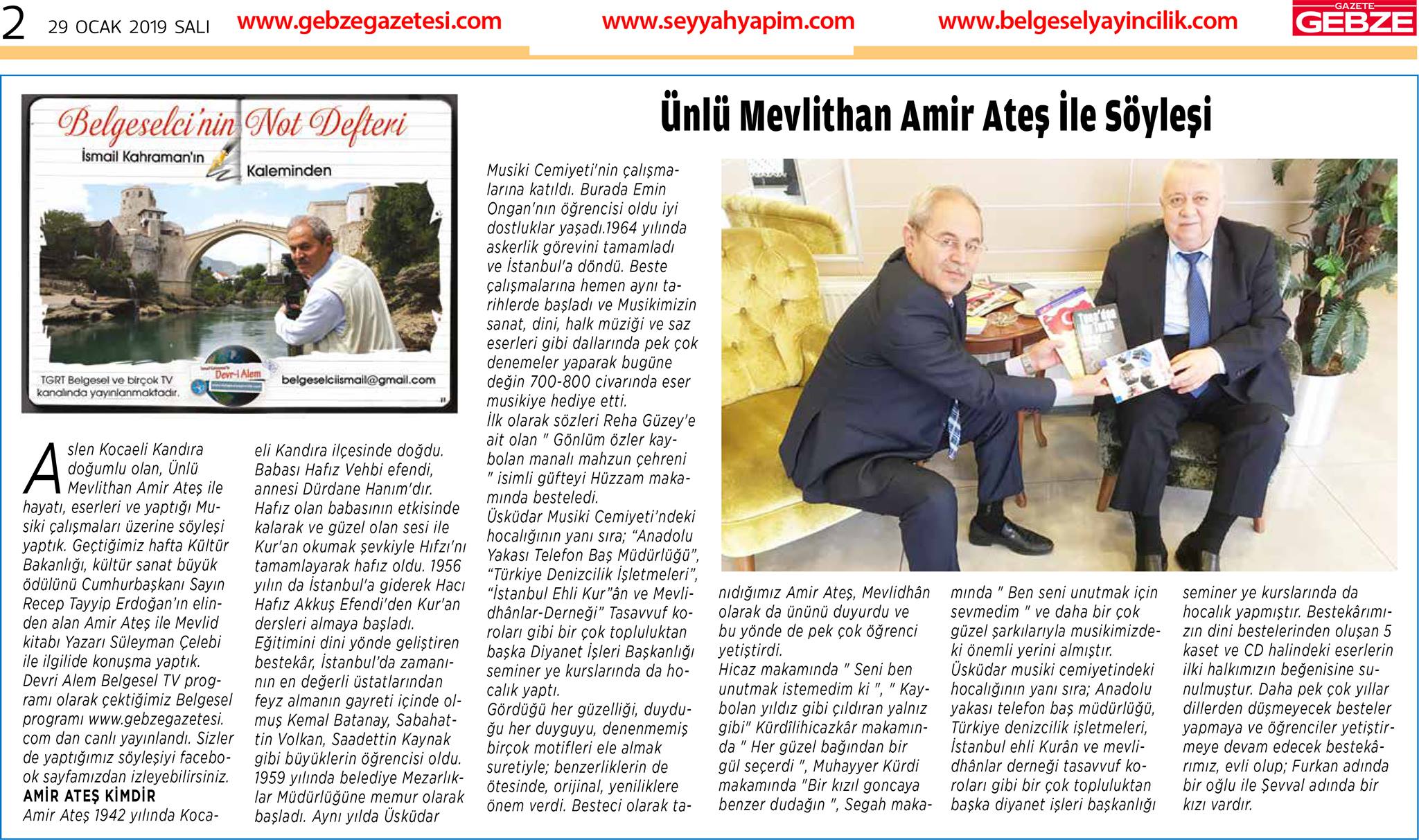 Aslen Kocaeli Kandıra doğumlu olan, Ünlü Mevlithan Amir Ateş ile hayatı, eserleri ve yaptığı Musiki çalışmaları üzerine söyleşi yaptık. Geçtiğimiz hafta Kültür Bakanlığı, kültür sanat büyük ödülünü Cumhurbaşkanı Sayın Recep Tayyip Erdoğan’ın elinden alan Amir Ateş ile Mevlid kitabı yazarı Süleyman Çelebi ile ilgilide konuşma yaptık. Devri Alem Belgesel tv programı olarak çektiğimiz Belgesel programı www.gebzegazetesi.com dan canlı yayınlandı. Sizler de yaptığımız söyleşiyi Facebook veya Youtube sayfamızdan izleyebilirsiniz: