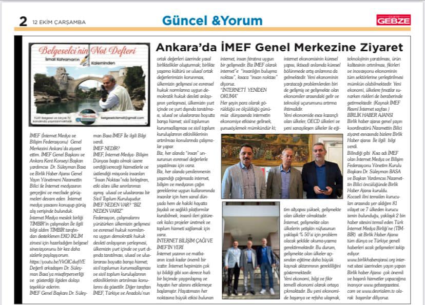 İMEF (İnternet Medya ve Bilişim Federasyonu) Genel Merkezini Ankara’da ziyaret ettim. İMEF Genel Başkanı ve Ankara Kent Konseyi Başkan yardımcısı Dr. Süleyman Basa ve Birlik Haber Ajansı Genel Yayın Yönetmeni Nizamettin Bilici ile İnternet medyasının gerçeğini ve meclisde görüşmeleri devam eden İnternet medya yasasını konuşup görüş alış verişinde bulunduk.