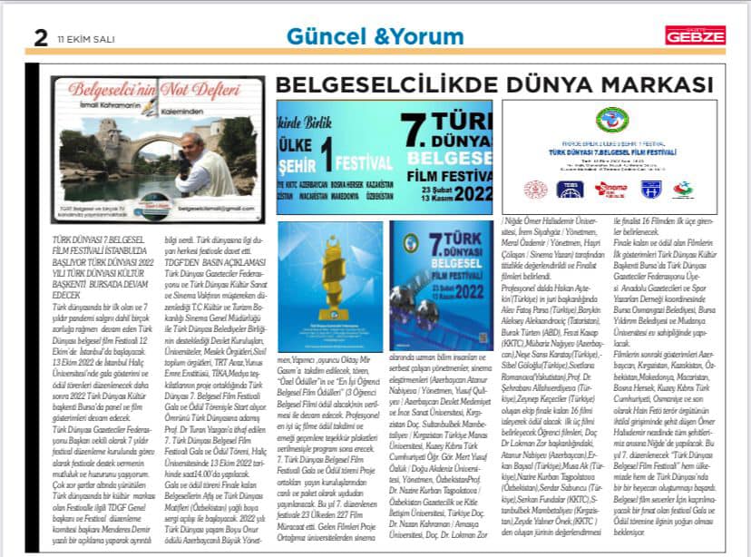 Gebze gazetesi www.gebzegazetesi.com ve gazete Gebze ve www.gebzegazete.com da belgeselcinin not defteri köşesinde 11 ekim 2022 tarihli makalem