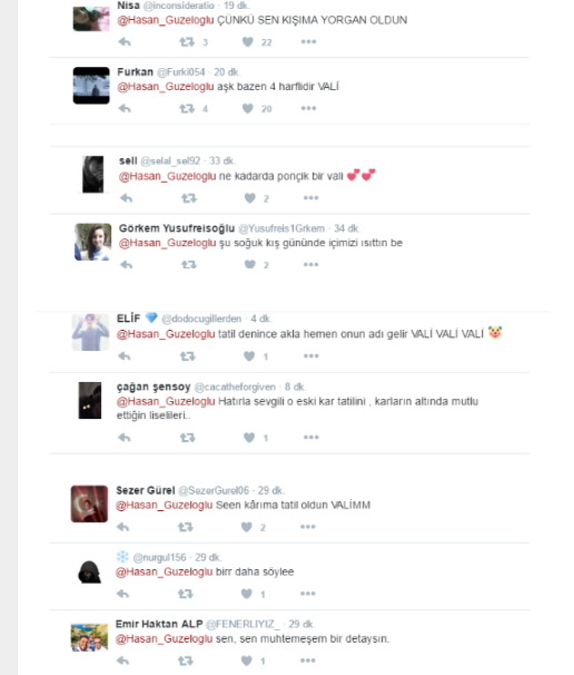 Vali Güzeloğlu'nun bu paylaşımının ardından sosyal medya hesabına birbirinden ilginç paylaşımlar yapıldı. Öğrenciler adeta vali Güzeloğlu’nun twiter sayfasına akın ettiler. Vali Güzeloğlu’nun paylaşımına yorumlarıyla katkıda bulunan öğrenciler, tatilin sevincini övgü dolu sözleriyle paylaştılar. Sosyal medyayı adeta sallayan öğrencilerin paylaşımları gülüşmelere neden olurken, bir öğrencinin “Sayın valim Allah sizi başımızdan eksik etmesin.... başka ile tayin atama kayyum dan falan Rabbim Kocaeli'yi korusun. “şeklinde ki ifadeleri ise Vali Güzeloğlu’nun Kocaeli’de ne kadar sevildiğini göstergesi oldu. Makam Valisi değil adeta hizmet valisi olan, ekmeğe yapılan zaman karşı verdiği mücadeleyle gönüllerde taht kuran, yetkilerini İlçe Kaymakamlarıyla paylaşarak adeta her ilçenin bir Valisi olmasını sağlayan Güzeloğlu bir kez daha gönüllerde taht kurduğunu göstermiş oldu.  Öğrencilerin o paylaşımlarından bazılarını sizlerle paylaşıyoruz.