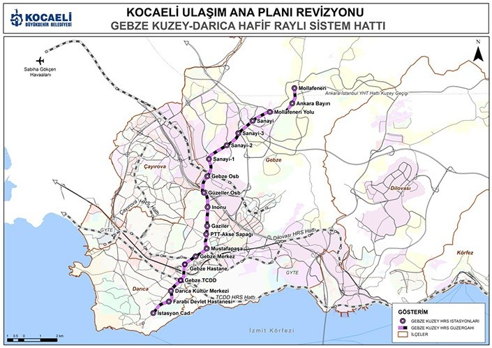 Kocaeli’deki ilk metronun istasyon noktaları , Darıca Sahili İstasyonu, Farabi Devlet Hastanesi, TCDD Tren İstasyonu, Fatih Devlet Hastanesi, Gebze Merkez İstasyonu, Gebze Belediye- Akse Sapağı İstasyonu, Gaziler İstasyonu, , Güzeller OSB İstasyonu, GOSB İstasyonu, Balçık sanayi İstasyonu, Mollafenari Sapağı İstasyonu ve Mollafenari Köyü İstasyonu olarak belirlendi. Çift hatlı olarak planlanan metronun uzunluğu 14.6 km. olacak ve bu güzergahta 12 istasyon bulunacak.