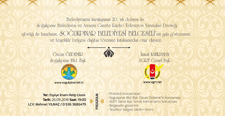 Soğukpınar Belediyesi Belgeseli tarihimi öğreniyor tabiatı seviyorum sosyal sorumluluk projesi kapsamında Avrasya Gazete Radyo Televizyon Yayıncıları Derneği www.agrt.net tarafından Devri Alem belgesel programı adı bir çok TV kanalında yayınlanacak belgeselin DVD si hem galaya gelenlere hem de, 25 Ekim’de İstanbul’da düzenlenecek Giresun tanıtım günlerinde dağıtılarak belediyenin tanınması sağlanacak. 70. Dakikalık Soğukpınar belgeselinin 9. Dakikalık tanıtım Sinevizyonunu izlemek için