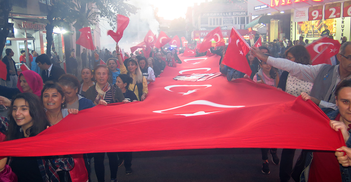Darıca'daki fener alayında Çınaraltı mevkisinde toplanan vatandaşlar, ellerinde Türk bayrağı ile meşalelerle Cumhuriyet Meydanı'na kadar yürüdü.