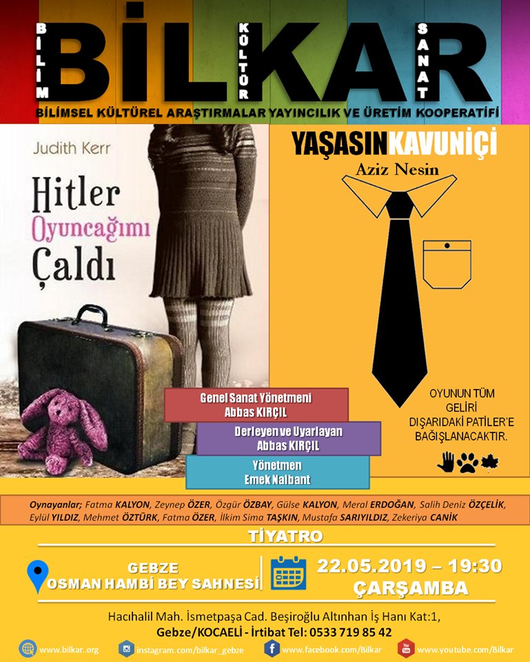 Alman yazar Judith Kerr’in aynı adlı eserinden sahneye derlenen, “Hitler Oyuncağımı Çaldı” ve Aziz Nesin’in yazdığı, “Yaşasın Kavuniçi” adlı oyun sahnelenecek. Her iki oyunda yönetmenliği Abbas Kırçıl; yönetmen yardımcılığını Emek Nalbant üstlendi. Rolleri, “Hitler Oyuncağımı Çaldı” adlı oyunda rolleri FatmaKalyon, Zeynep Özer, Özgür Özbay, Gülse Kalyon, Meral Erdoğan, Salih Deniz Özçelik, Eylül Yıldız, Mehmet Öztürk, Fatma Özer, İlkim Sima Taşkın, Mustafa Sarıyıldız ve Zekeriya Canik üstlendi. Oyun; Nazi Almanya’sının dönemindeki baskıyı ve yaratılan korku ortamını anlatıyor. “Yaşasın Kavuniçi” adlı oyunda ise Fatma Kalyon, Özgür Özbay, Güler Kalyon, Zekeriya Canik ve Mustafa Sarıyıldız rolleri paylaştı. Aziz Nesin’in kısa oyunlarından biri olan Yaşasın Kavuniçi’de sürekli ihtilaller olan bir Muz Cumhuriyeti’nde bir ailenin başından geçen komik olaylar konu edilmiş.