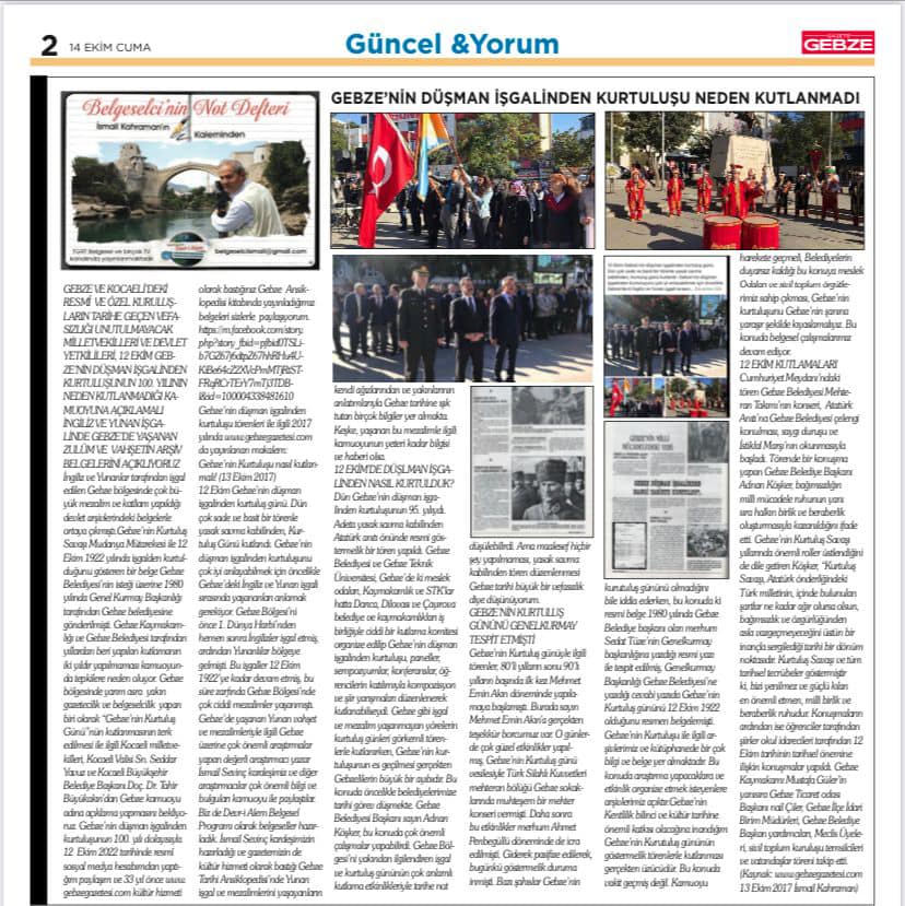 İngiliz ve Yunanlar tarafından işgal edilen Gebze bölgesinde çok büyük mezalim ve katliam yapıldığı devlet arşivlerindeki belgelerle ortaya çıkmıştı.Gebze’nin Kurtuluş Savaşı Mudanya Mütarekesi ile 12 Ekim 1922 yılında işgalden kurtulduğunu gösteren bir belge Gebze Belediyesi’nin isteği üzerine 1980 yılında Genel Kurmay Başkanlığı tarafından Gebze belediyesine gönderilmişti. Gebze Kaymakamlığı ve Gebze Belediyesi tarafından yıllardan beri yapılan kutlamanın iki yıldır yapılmaması kamuoyunda tepkilere neden oluyor. Gebze bölgesinde yarım asra yakın gazetecilik ve belgeselcilik yapan biri olarak “Gebze’nin Kurtuluş Günü”nün kutlanmasının terk edilmesi ile ilgili Kocaeli milletvekilleri, Kocaeli Valisi Sn. Seddar Yavuz ve Kocaeli Büyükşehir Belediye Başkanı Doç. Dr. Tahir Büyükakın’dan Gebze kamuoyu adına açıklama yapmasını bekliyoruz. Gebze’nin düşman işgalinden kurtuluşunun 100. yılı dolayısıyla 12 Ekim 2022 tarihinde resmî sosyal medya hesabımdan yaptığım paylaşım ve 33 yıl önce www.gebzegazetesi.com kültür hizmeti olarak bastığınız Gebze Ansiklopedisi kitabında yayınladığımız belgeleri sizlerle paylaşıyorum.