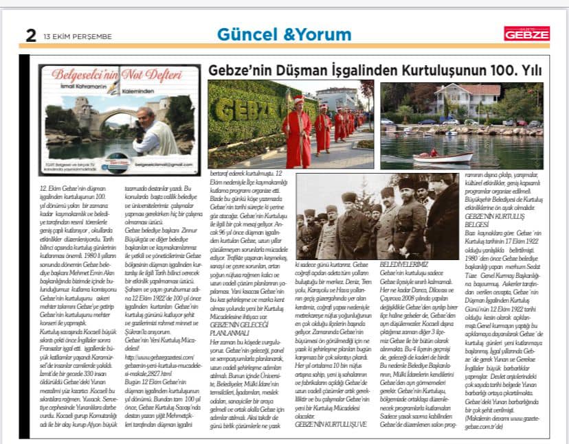 Gebze gazetesi www.gebzegazetesi.com ve gazete Gebze ile www.gebzegazete.com da belgeselcinin not defteri köşesinde 13 ekim 2022 tarihinde yayınlanan makalemiz