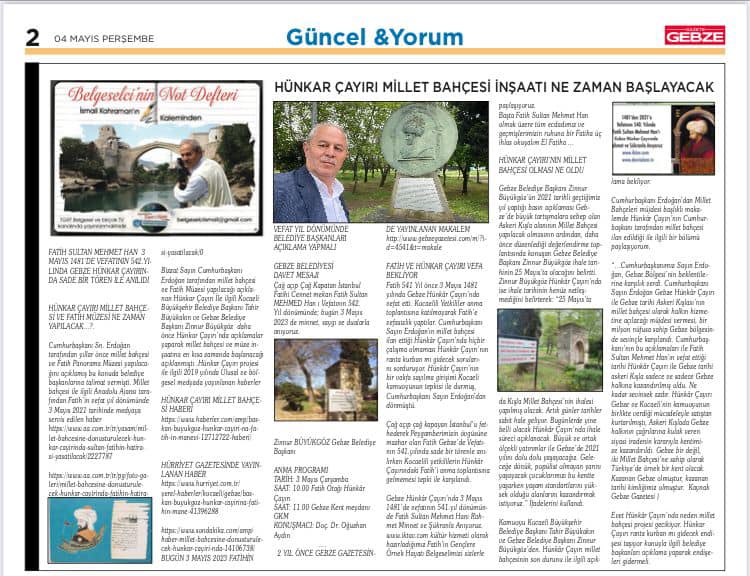 Fatih 541 Yıl önce 3 Mayıs 1481 yılında Gebze Hünkâr Çayırı’nda vefat etti. Kocaelili Yetkililer anma toplantısına katılmayarak Fatih’e vefasızlık yaptılar. Cumhurbaşkanı Sayın Erdoğan’ın millet bahçesi ilan ettiği Hünkâr Çayırı’nda hiçbir çalışma olmaması Hünkâr Çayırı’nın ranta kurban mı gidecek sorularını sorduruyor. Hünkâr Çayırı’nın bir vakfa sayılma girişimi Kocaeli kamuoyunun tepkisi ile durmuş, Cumhurbaşkanı Sayın Erdoğan’dan dönmüştü.