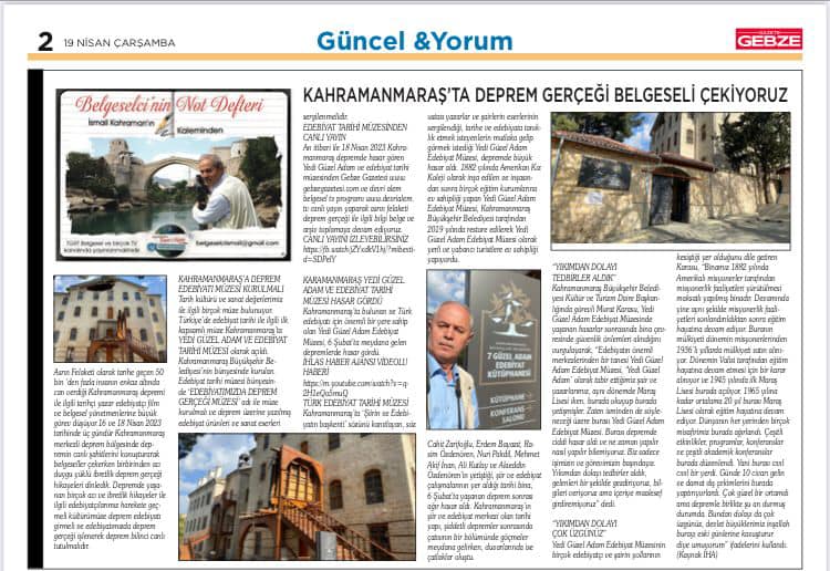 An itibari ile 18 Nisan 2023 Kahramanmaraş depremde hasar gören Yedi Güzel Adam ve edebiyat tarihi müzesinden Gebze Gazetesi www.gebzegazetesi.com ve devri alem belgesel tv programı www.devrialem.tv canlı yayın yaparak asrın felaketi deprem gerçeği ile ilgili bilgi belge ve arşiv toplamaya devam ediyoruz.