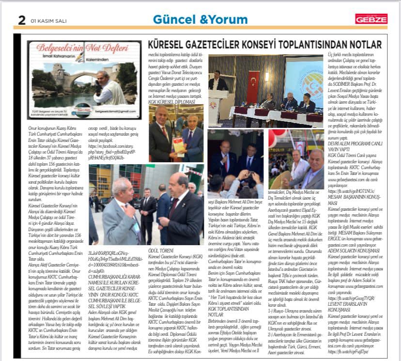 Onur konuğunun Kuzey Kıbrıs Türk Cumhuriyeti Cumhurbaşkanı Ersin Tatar olduğu Küresel Gazeteciler Konseyi’nin Küresel Medya Çalıştayı ve Ödül Töreni Alanya’da 18 ülkeden 37 yabancı gazeteci dahil toplam 156 gazetecinin katılımı ile gerçekleştirildi. Toplantıya Küresel gazeteciler konseyi kültür sanat politikaları kurulu başkanı olarak. Danışma kurulu toplantısına katılıp görüşlerimi bir rapor halinde sundum.