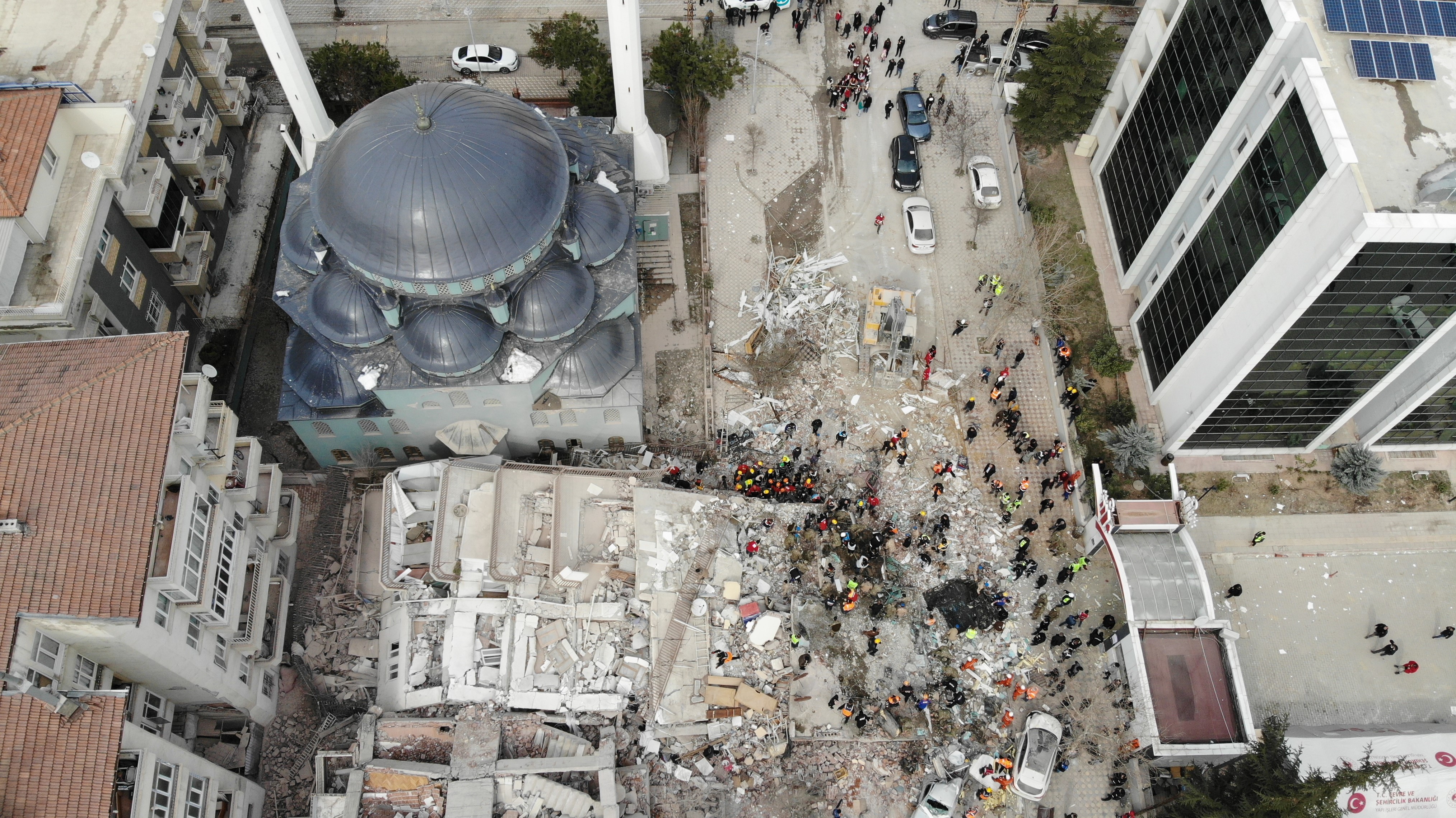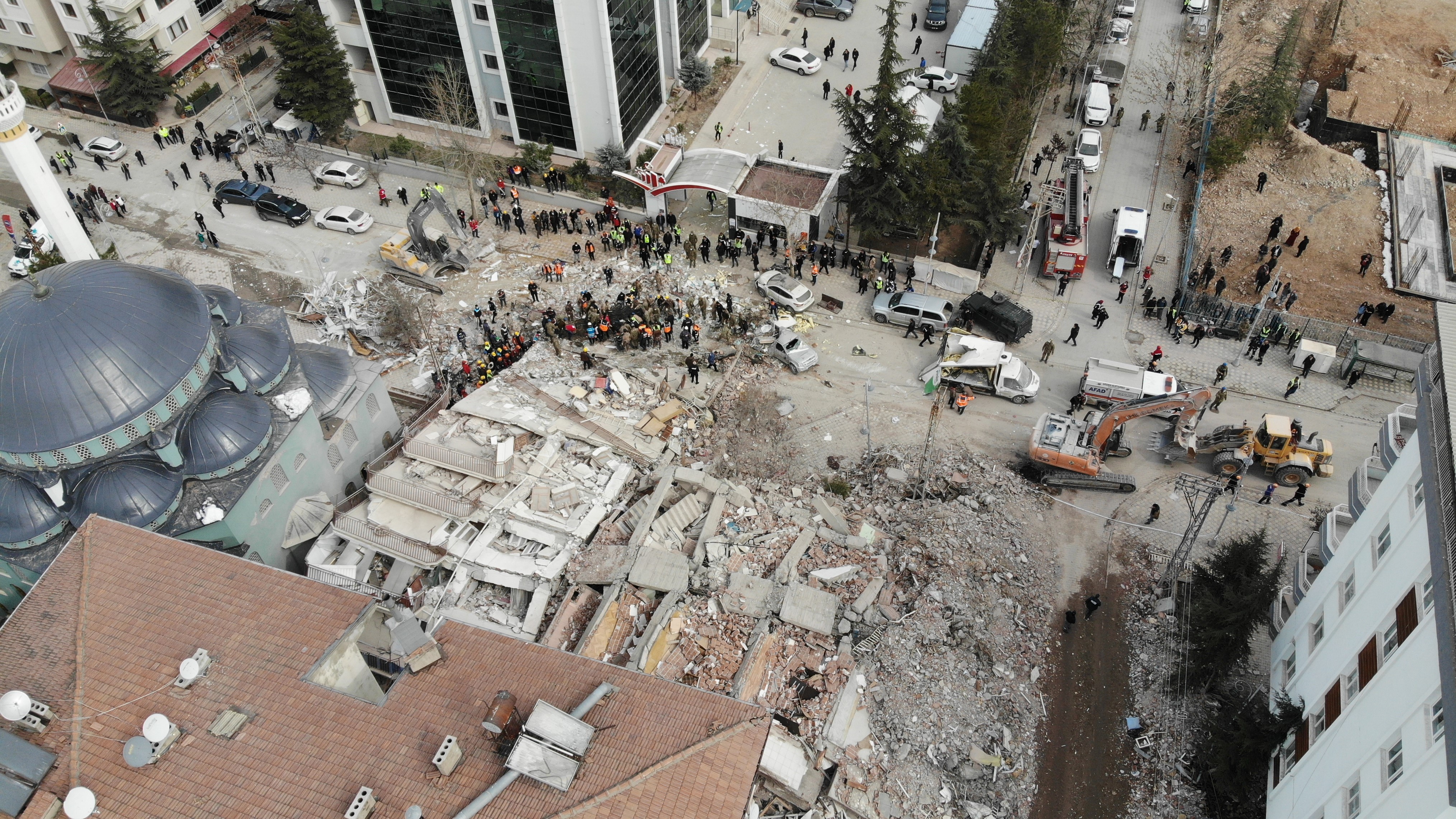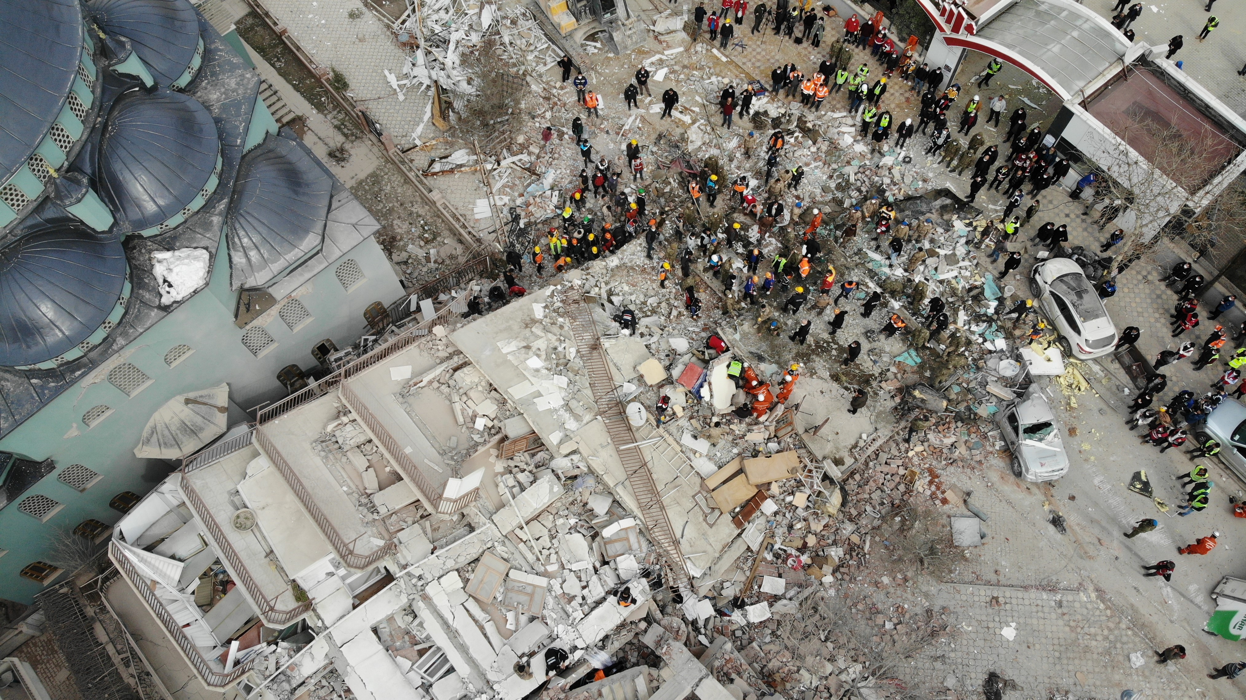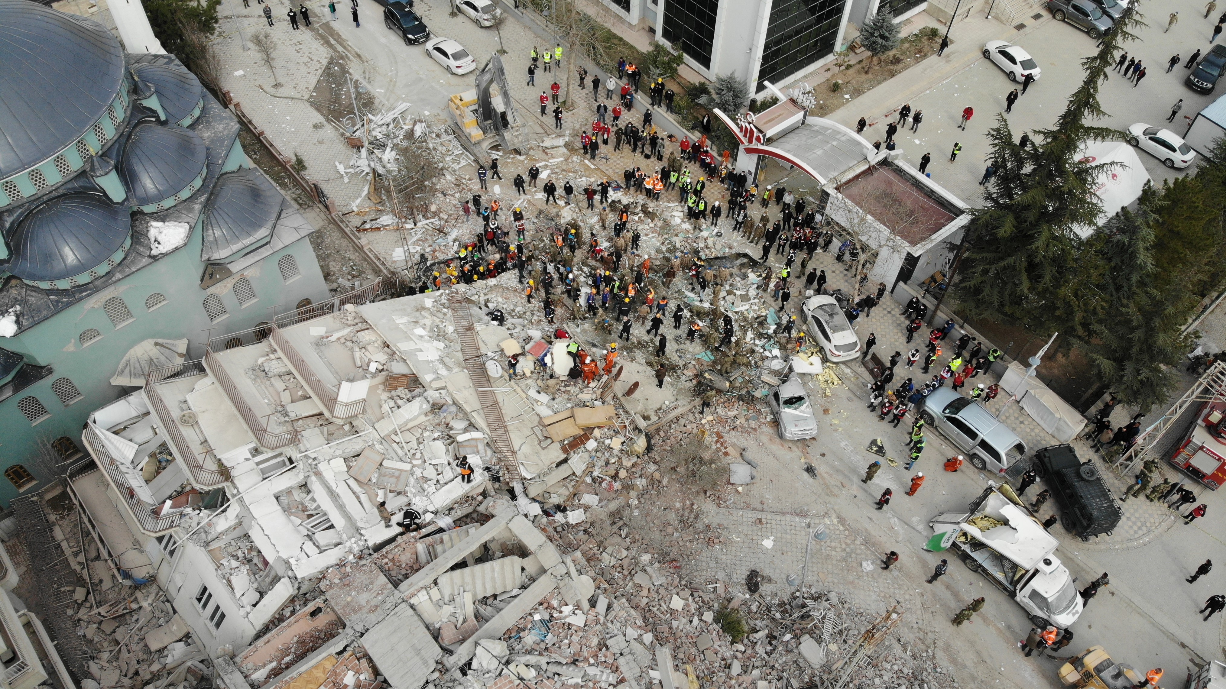 Malatya’da enkaz altında kalan vatandaşların kurtarılması için arama kurtarma ekipleri çalışmalarına devam ederken, Battalgazi ilçesi Zafer Mahallesi Necip Fazıl Kısakürek Caddesi'nde 5 katlı bir binada 3 kişiyi arama kurtarma çalışması dron ile görüntülendi.