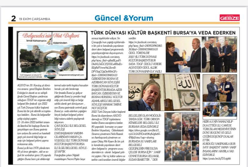AGSYD’nin 30. Kuruluş yıl dönümü anısına genel Başkan İbrahim Erdoğan’ın daveti ve ev sahipliğinde Genel Başkan yardımcısı olduğum TDGF’nin organize ettiği belgesel film festivali için 2022 yılı Türk Dünyası kültür başkenti Bursa’da bir çok etkinlik ve toplantıya katıldım. Bursa’da belgeseller çekip söyleşi yaptım.