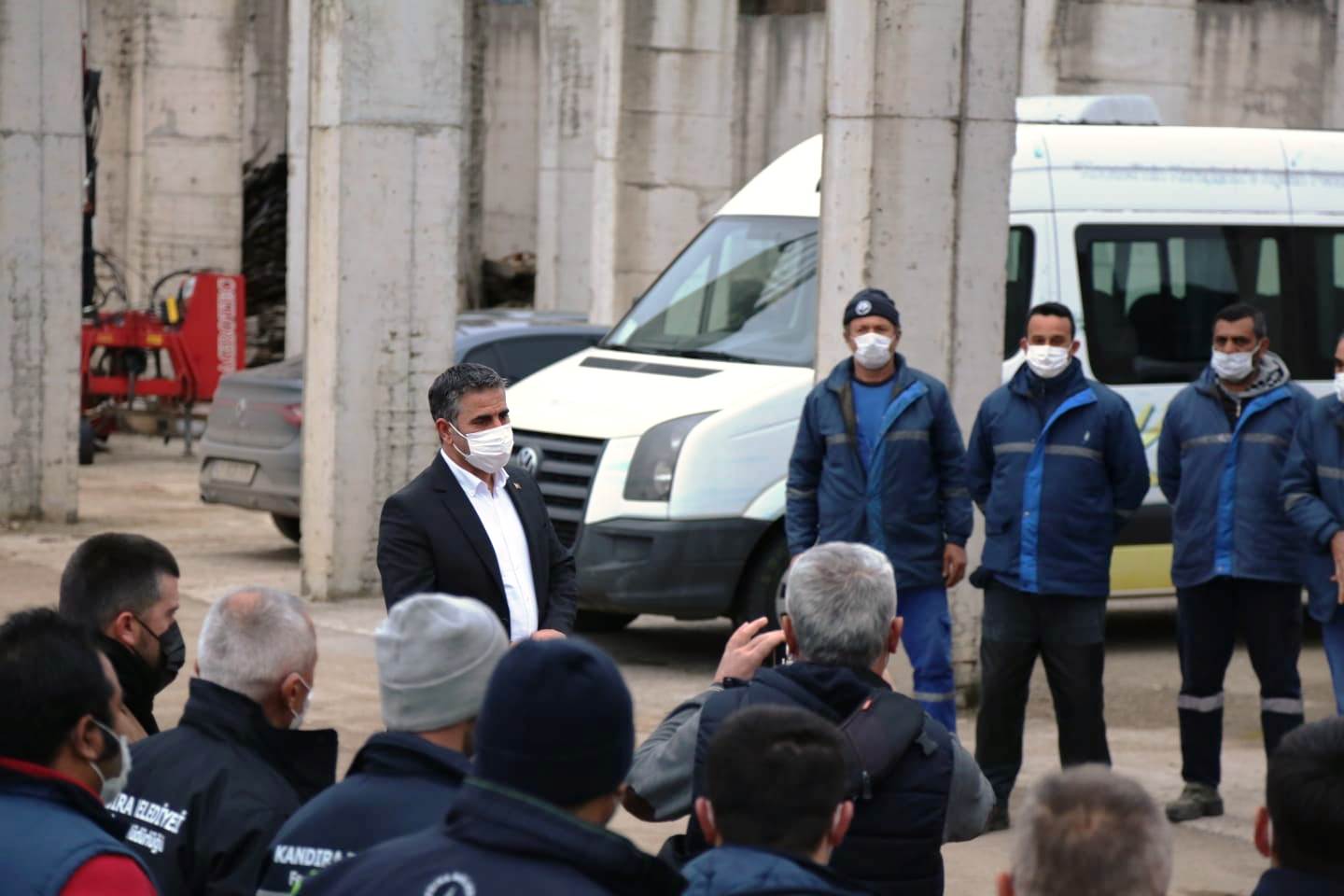 İş dağıtımı öncesi Garaj Amirliği'ni ziyaret eden Belediye Başkanı Turan, yağış sırasında sahada Fen İşleri ve Temizlik İşleri Müdürlüğü bünyesinde görev yapan personele özverili çalışmalarından dolayı teşekkür etti.
