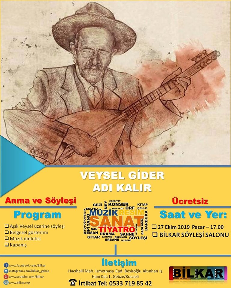 27 Ekim Pazar günü saat 17.00’de BİLKAR’ın Hacı Halil Mahallesi, İsmetpaşa Caddesi, Beşiroğlu Altın Han’daki yerinde söyleşi salonunda gerçekleşecek programda Aşık Veysel üzerine söyleşi, belgesel gösterimi ve müzik dinletisi gerçekleşecek.