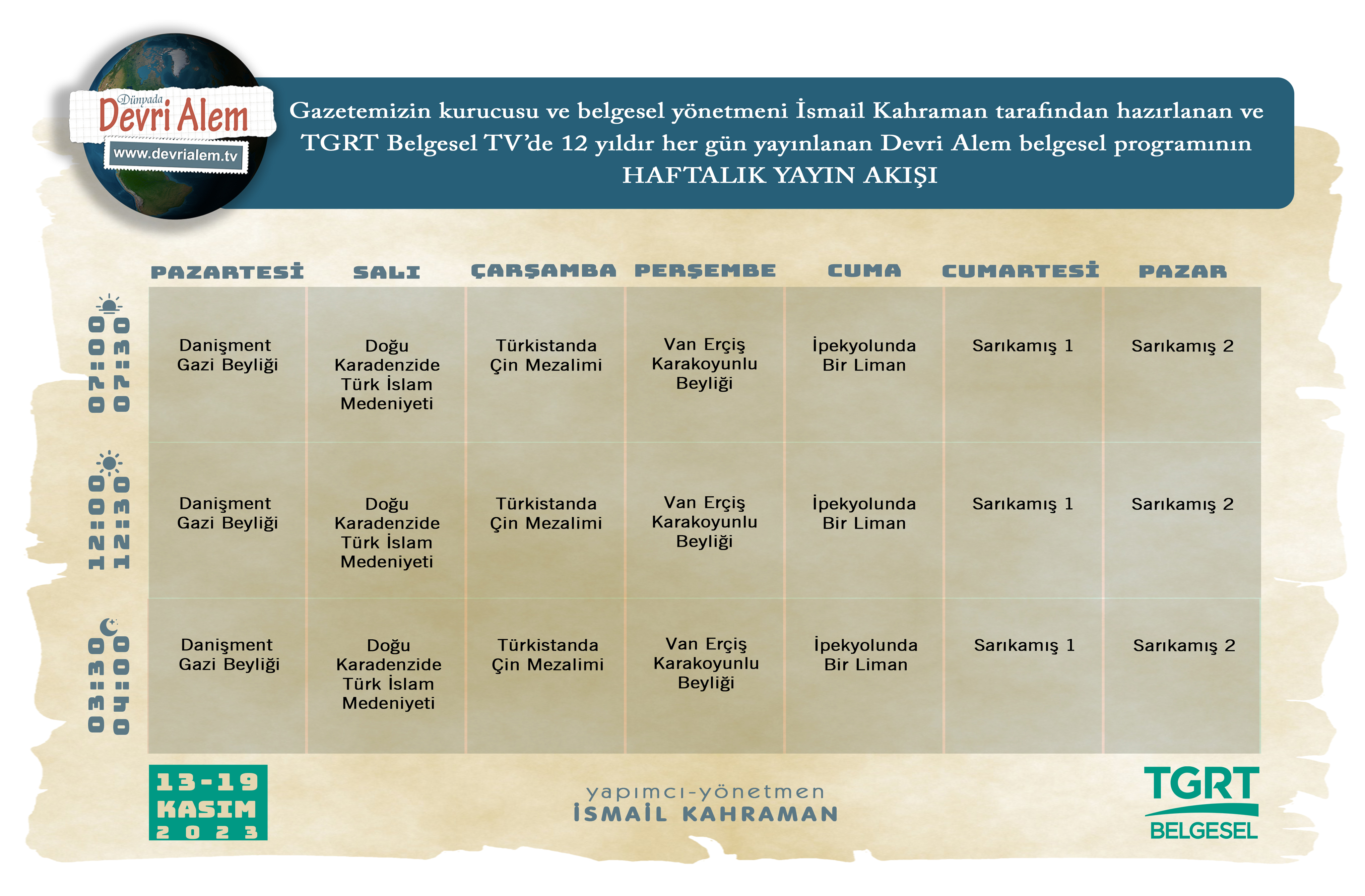 Sabah 07:00-07:30, öğlen 12:00-12:30 ve gece 03:30-04:00 olmak üzere her gün, günde üç defa TGRT Belgesel ekranlarında olan Devri Alem belgesel programı 13-19 Kasım haftasında yine TGRT ekranlarında olacak.