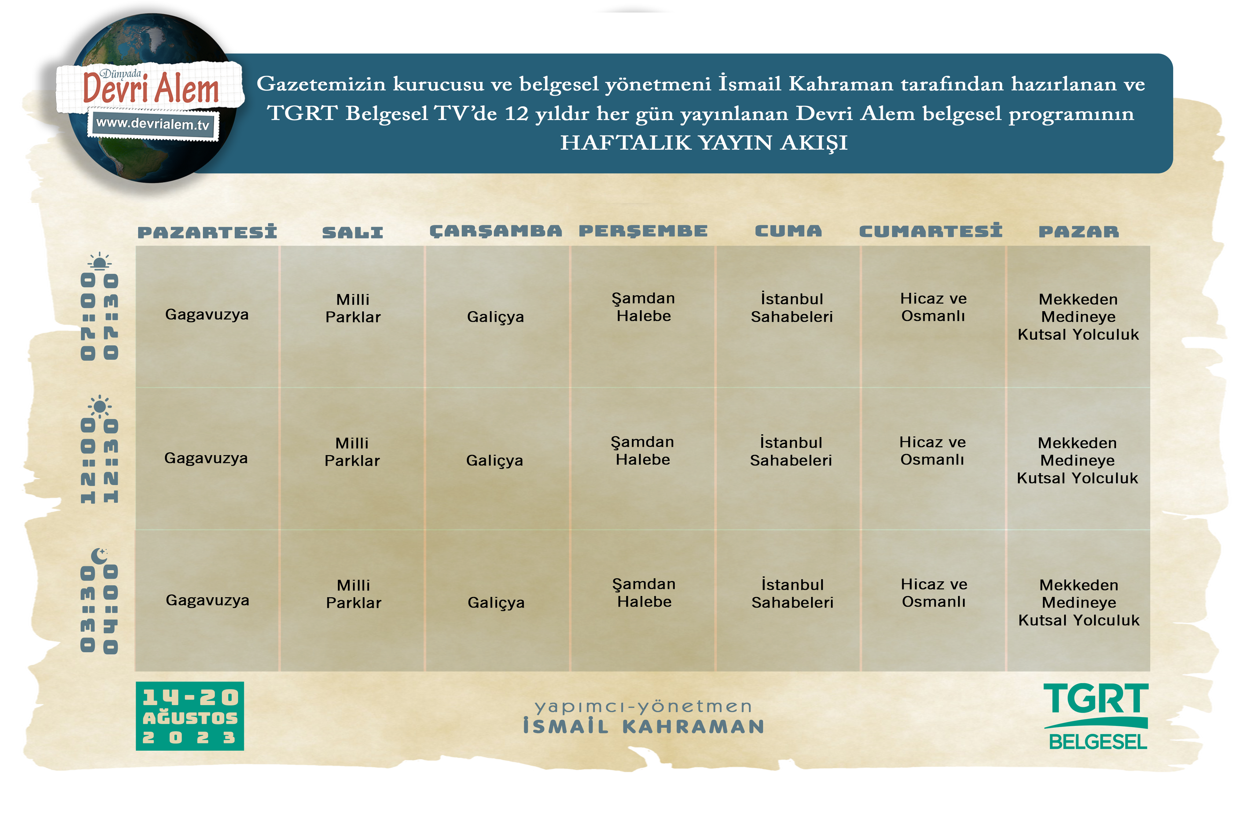 Sabah 07:00-07:30, öğlen 12:00-12:30 ve gece 03:30-04:00 olmak üzere her gün, günde üç defa TGRT Belgesel ekranlarında olan Devri Alem belgesel programı 14-20 Ağustos haftasında yine TGRT ekranlarında olacak.