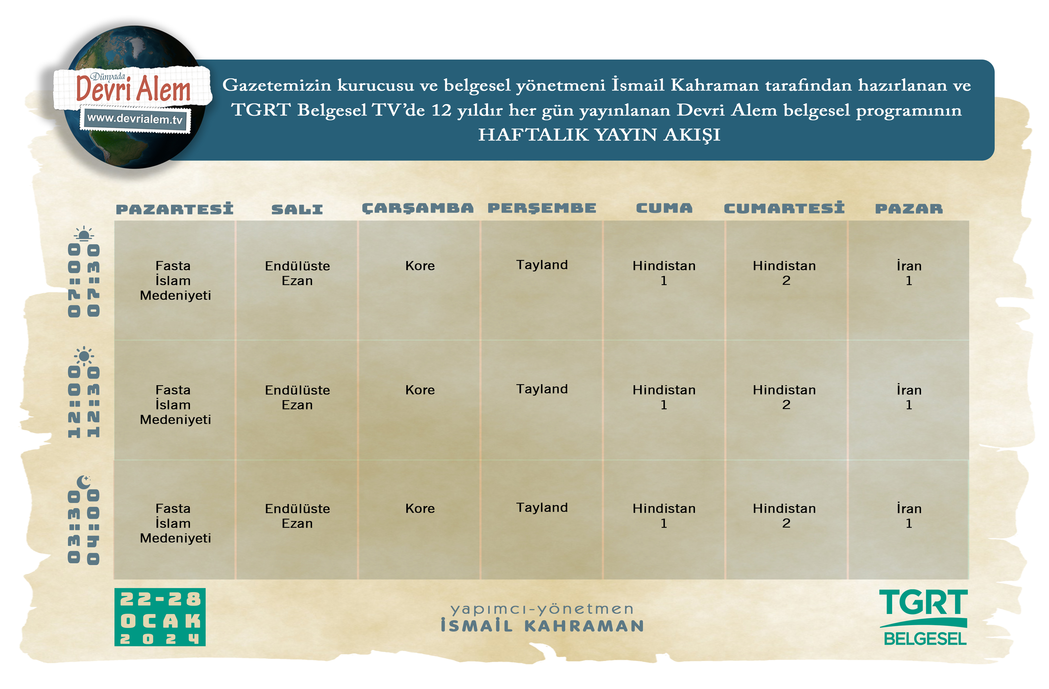 Sabah 07:00-07:30, öğlen 12:00-12:30 ve gece 03:30-04:00 olmak üzere her gün, günde üç defa TGRT Belgesel ekranlarında olan Devri Alem belgesel programı 22-28 Ocak 2024 haftasında yine TGRT ekranlarında olacak.