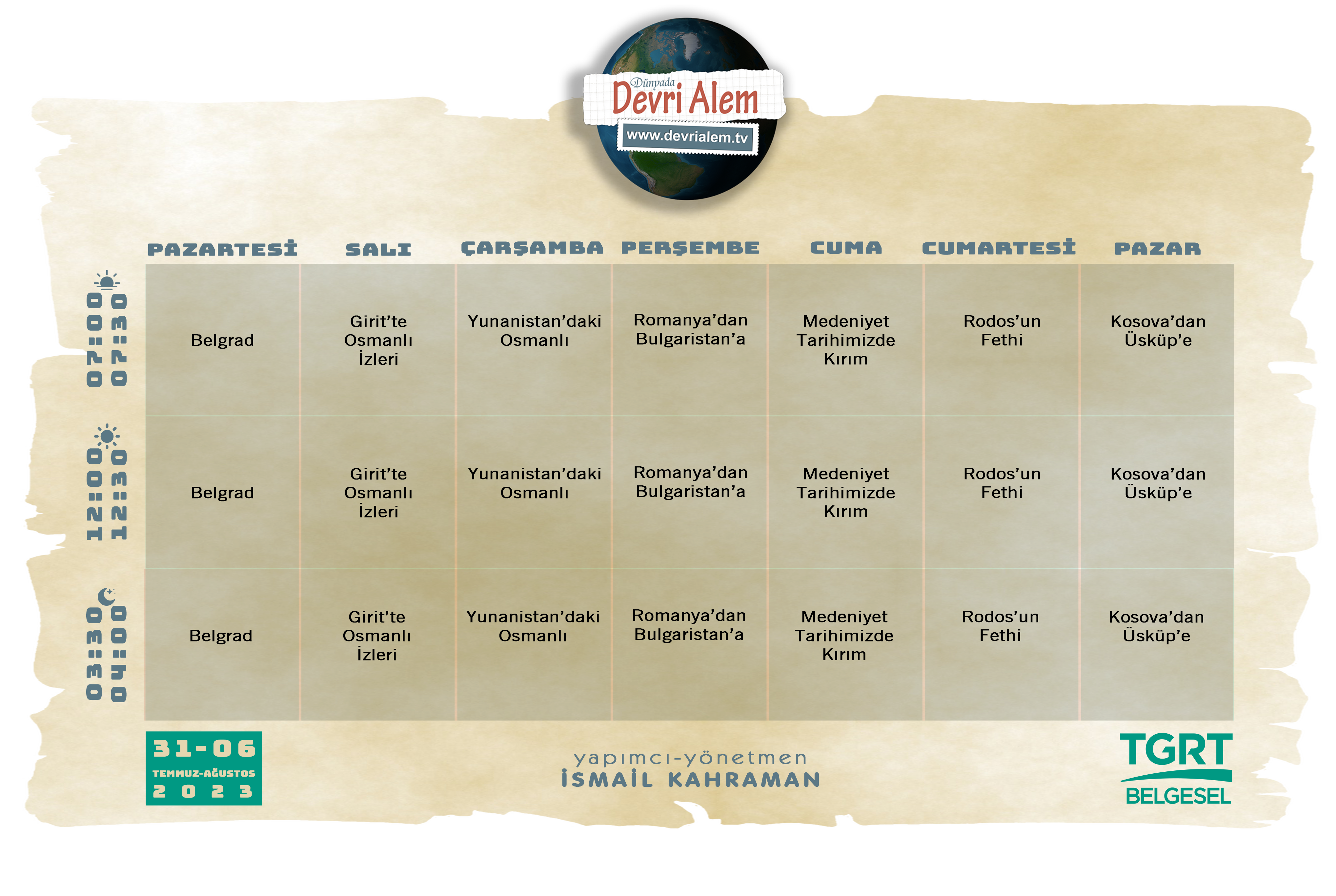 Sabah 07:00-07:30, öğlen 12:00-12:30 ve gece 03:30-04:00 olmak üzere her gün, günde üç defa TGRT Belgesel ekranlarında olan Devri Alem belgesel programı 31 Temmuz-06 Ağustos haftasında yine TGRT ekranlarında olacak.