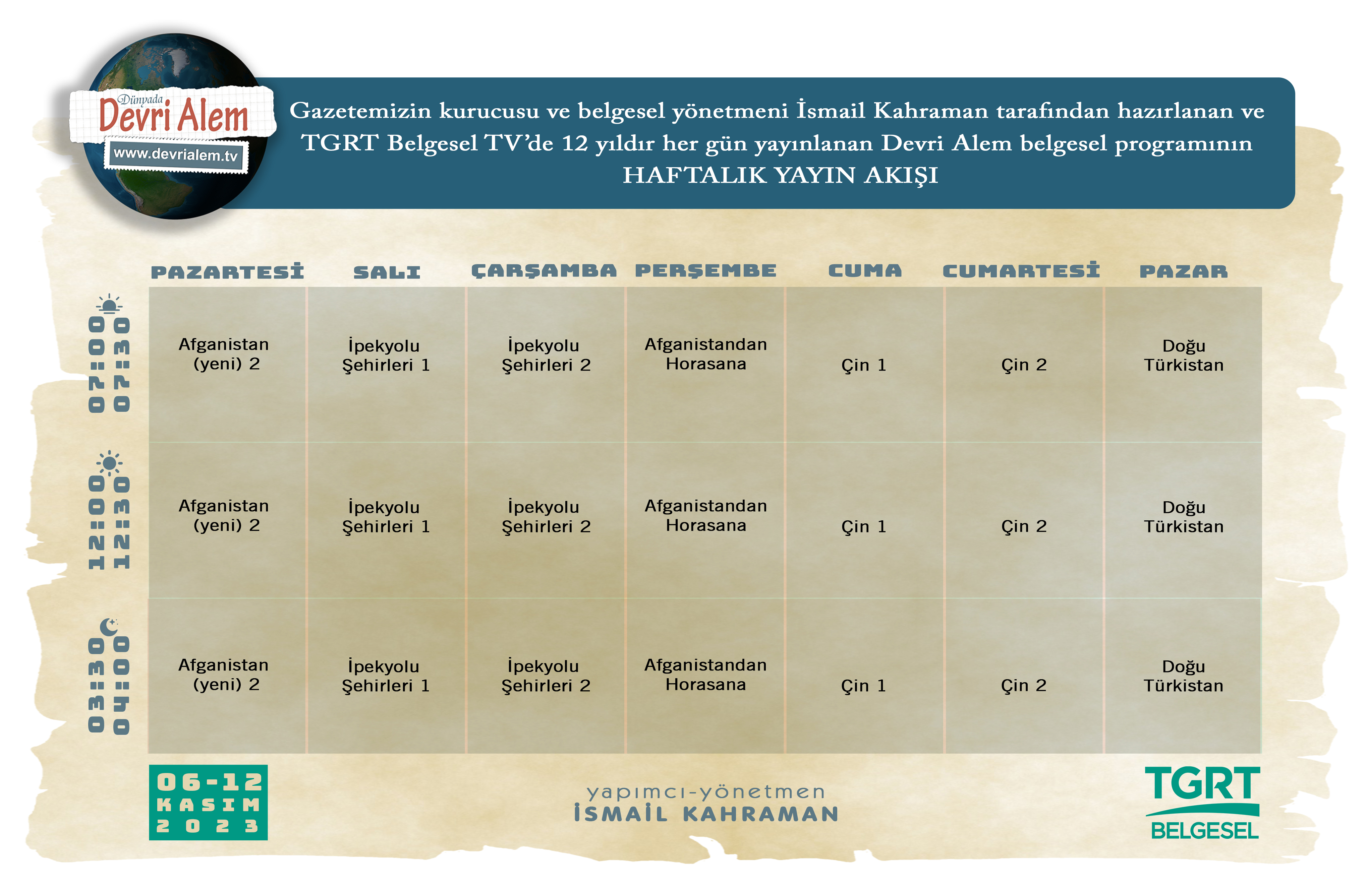Sabah 07:00-07:30, öğlen 12:00-12:30 ve gece 03:30-04:00 olmak üzere her gün, günde üç defa TGRT Belgesel ekranlarında olan Devri Alem belgesel programı 6-12 Kasım haftasında yine TGRT ekranlarında olacak.