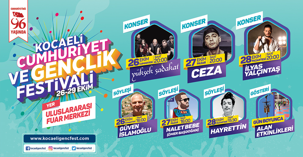 Kocaeli Büyükşehir Belediyesi, 26-29 Ekim tarihleri arasında Kocaeli’nin birçok merkezinde birbirinden farklı etkinliklerle 29 Ekim Cumhuriyet Bayramı’nın 96’ıncı yılı kutlamalarına coşku ve anlam katmak için ‘’Kocaeli Cumhuriyet ve Gençlik Festivali’’ düzenleyecek. Lise ve üniversite gençliğinin yer alacağı festivalde etkinlikler, gösteriler, tanınmış sanatçılar ve konserler yer alacak. Gençlik ve Spor Hizmetleri Dairesi Başkanlığı ile Şube Müdürlükleri koordinasyonunda bu yıl ikincisi düzenlenen festivale, katılımın yoğun olması bekleniyor.