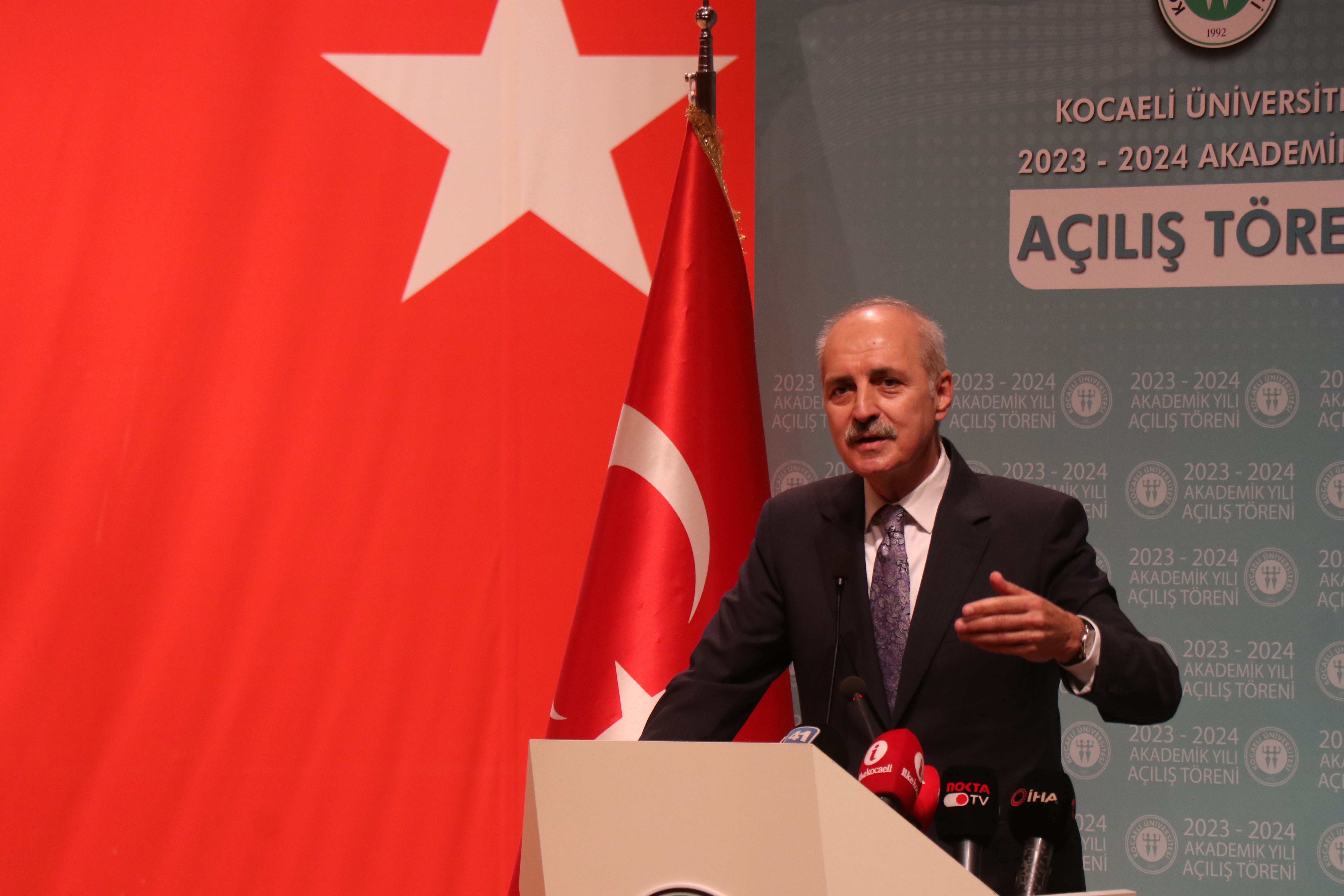 Kocaeli Üniversitesi 2023-2024 Akademik Yılı açılışı, TBMM Başkanı Numan Kurtulmuş’un katılımıyla gerçekleşti. Baki Komsuoğlu Kültür Merkezi’nde gerçekleştirilen törende konuşan Kurtulmuş, "Türkiye olarak tarihi bir dönemden geçiyoruz. 2023 uzunca bir süredir konuştuğumuz ve artık içinde bulunduğumuz bir yıl. Bu yıl tesadüfen içinde bulunmuş olmanın ötesinde bizim için tarihi öneme sahip geliyor. Cumhuriyetimizin ilk yüzyılını geride bırakıyoruz ve önümüzdeki hafta 29 Ekim ile birlikte cumhuriyetimizin ikinci yüzyılına erişiyoruz. Şimdi önümüzde hep daha büyük hedefleri koymuş bir millet olarak cumhuriyetimizin ikinci yüzyılına ilişkin hedefimiz, varmak istediğimiz bir nokta, ulaşmak istediğimiz bir gayemiz olduğu açıktır. Sözü güçlü, gücü tesirli bir Türkiye'nin yüzyılını cumhuriyetimizin ikinci yüzyılını bu şekle getirmek için el birliğiyle gayret sarf edeceğiz. Esasen bizim milletimiz sadece Anadolu topraklarına geldiğinden bu yana değil, varlığından bu yana hep önüne hedef koymuş. Hiçbir zaman iki gününü eşit geçirmemiş, hep ileriye doğru atılım yapmış ve bu atılımlarını da gerçekleştirmiştir. Bundan bir asır evvel cumhuriyetimizin kuruluşundan evvel verilen o büyük ulusal kurtuluş mücadelemizi hep beraber çok iyi biliyor, çok iyi özümsüyoruz. Bunu sadece bir tarih olarak değil, o günlerden bugüne ders çıkarmak için çok daha iyi bir şekilde gözden geçirmemiz lazım. Her şeyden evvel başta Gazi Mustafa Kemal Atatürk olmak üzere ulusal kurtuluş mücadelesinde bütün imkanlarımızı seferber ederek büyük bir zafer kazanmış olan ecdadımızın hepsini saygıyla anıyoruz" dedi.