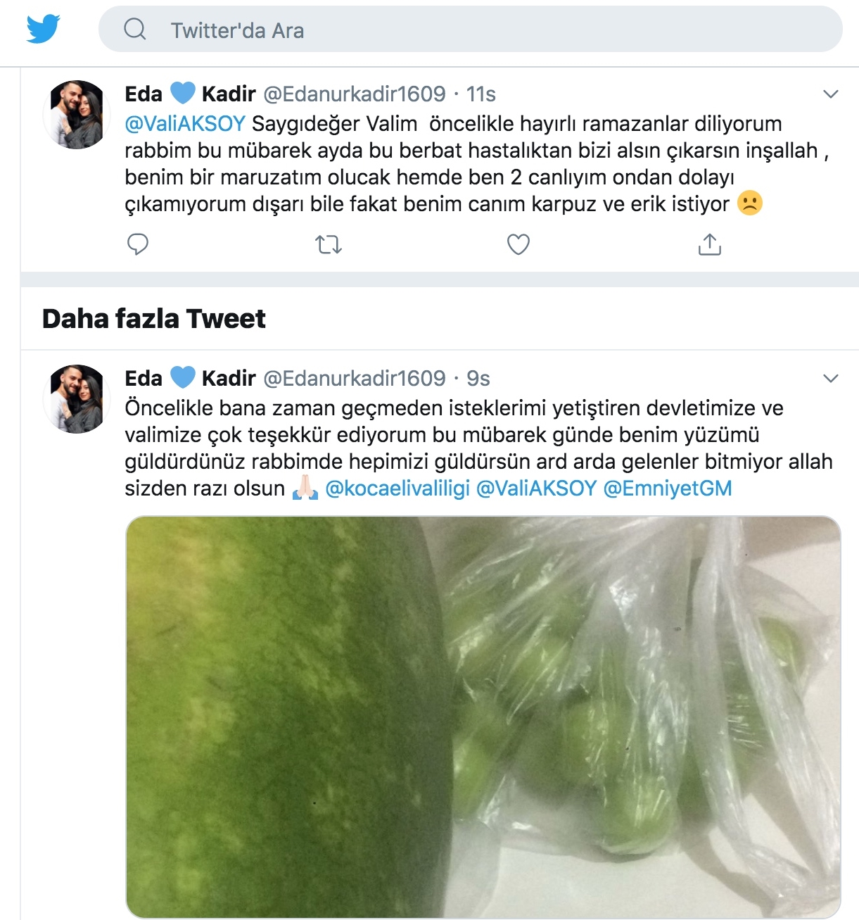 Hamile kadının, "Saygıdeğer Valim, öncelikle hayırlı ramazanlar diliyorum. Rabbim bu mübarek ayda bu berbat hastalıktan bizi alsın çıkarsın inşallah. Benim bir maruzatım olacak, ben iki canlıyım ondan dolayı çıkamıyorum dışarı bile fakat canım karpuz ve erik istiyor." paylaşımı üzerine Vali Aksoy'un talimatıyla yetkililer aileyle irtibat kurdu.
