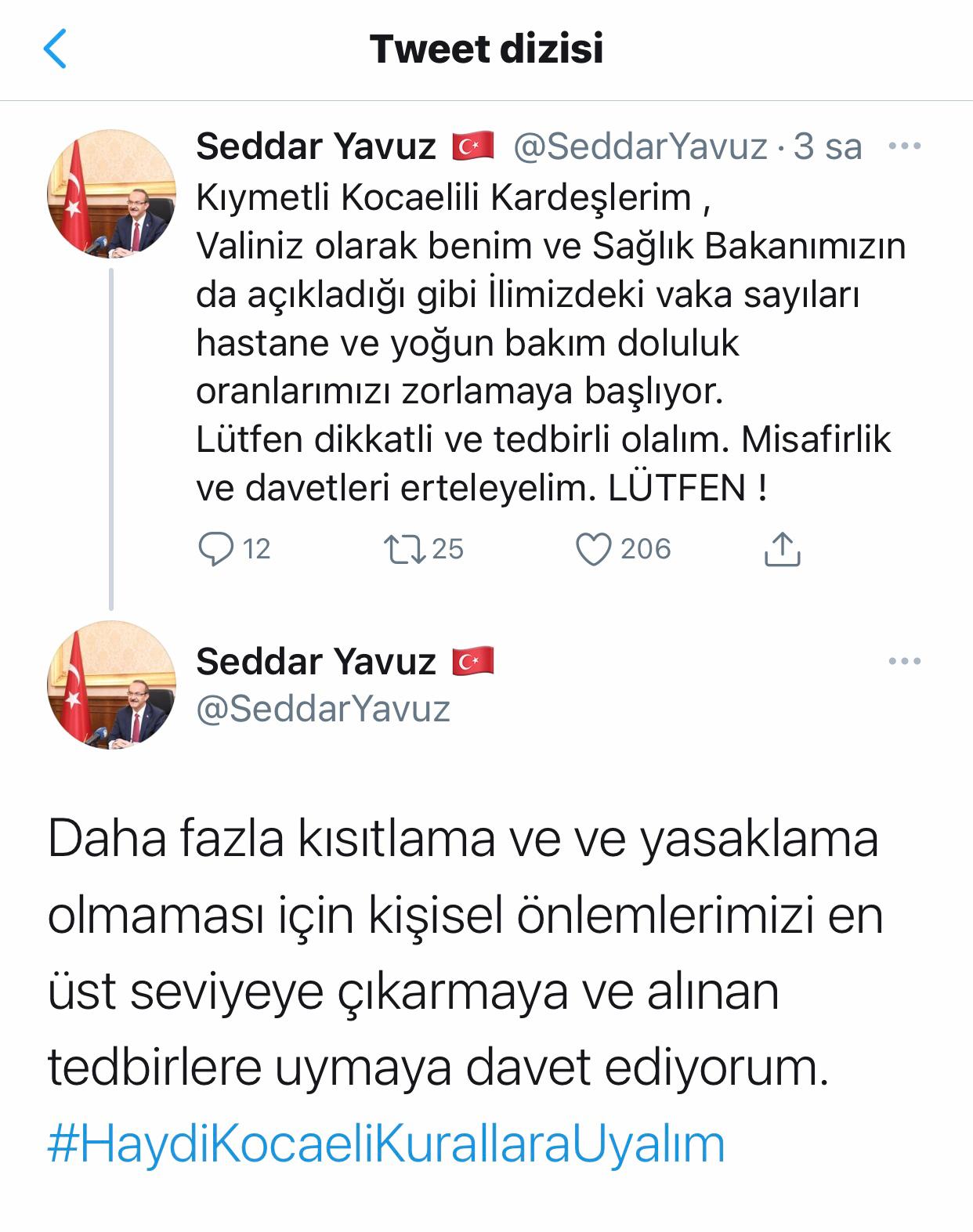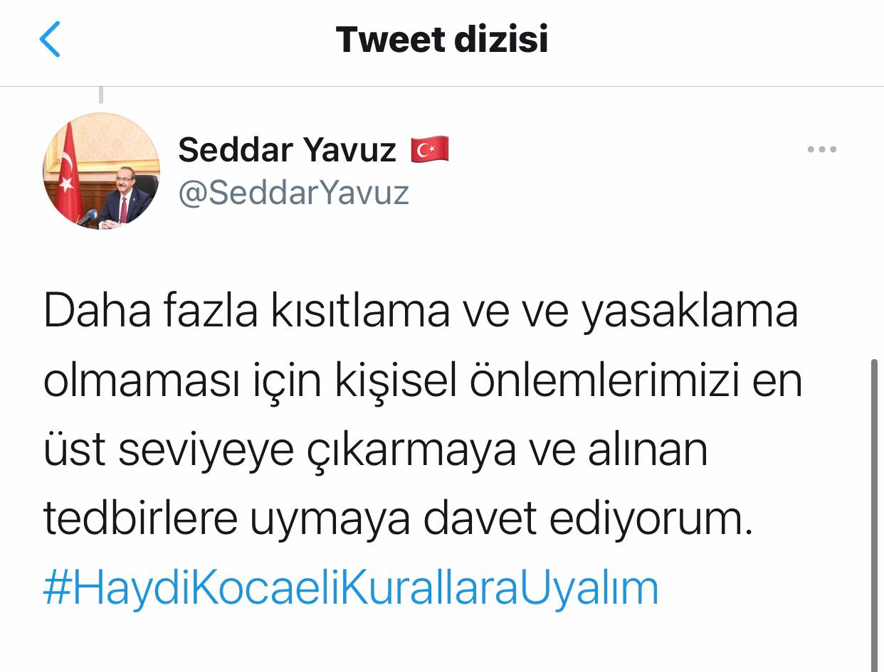 İldeki vaka sayılarının hastane ve yoğun bakım doluluk oranlarını zorladığını vurgulayan Yavuz, "Lütfen dikkatli ve tedbirli olalım. Misafirlik ve davetleri erteleyelim. Daha fazla kısıtlama ve yasaklama olmaması için kişisel önlemlerimizi en üst seviyeye çıkarmaya ve alınan tedbirlere uymaya davet ediyorum." ifadelerini kullandı.