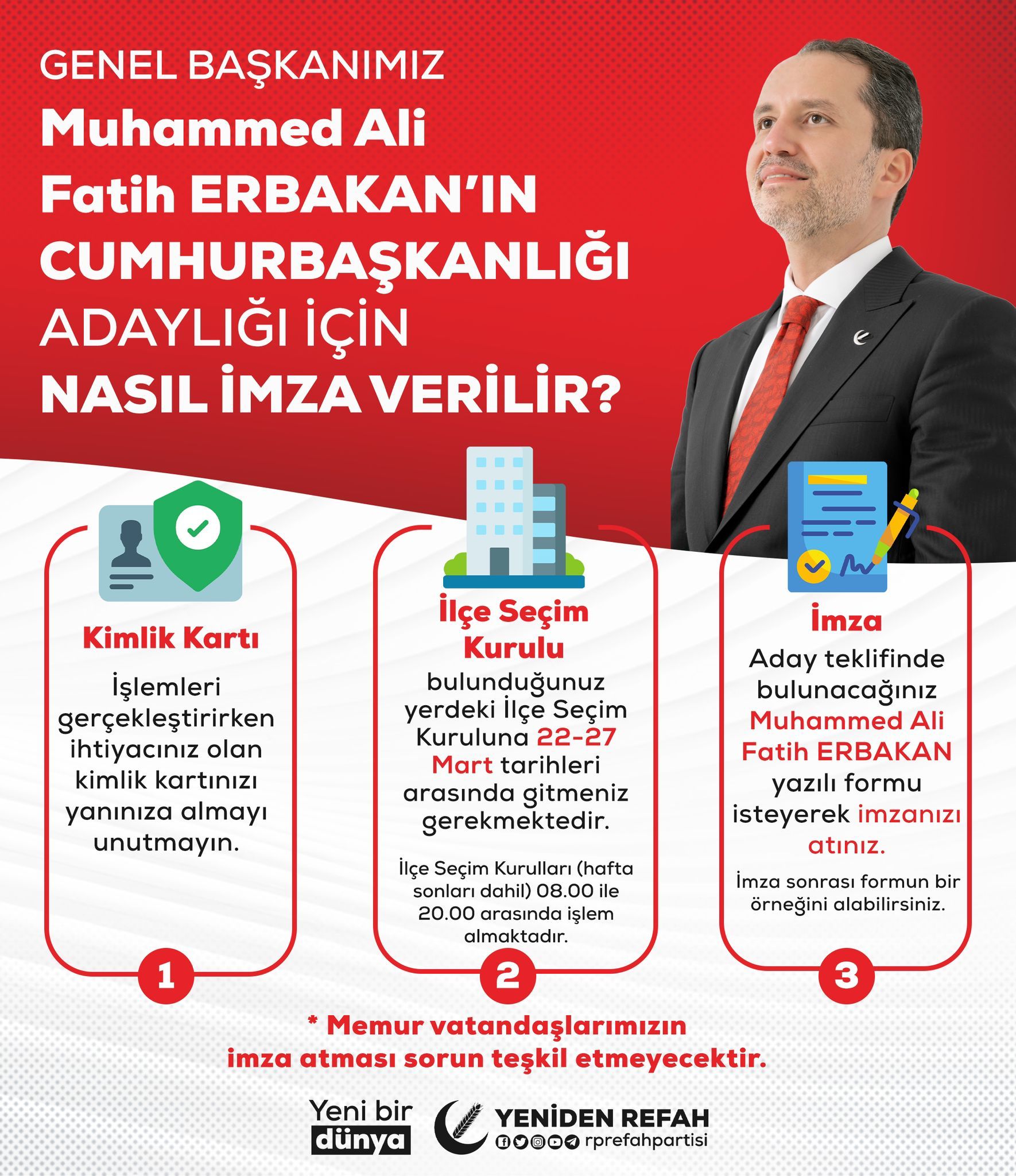 Siz değerli hemşerilerimizden YSK’ya başvuru süresinin başlamasıyla birlikte yasal süre içinde Genel Başkanımız Dr. Fatih Erbakan’a aday olması için oy vermeye tüm Kocaelili vatandaşlarımızı davet ediyorum. Oy verme işlemleri YSK'nın belirtiği 22 Mart-27 Mart tarihleri arasında 100 bin imza toplamaları gerekecek.