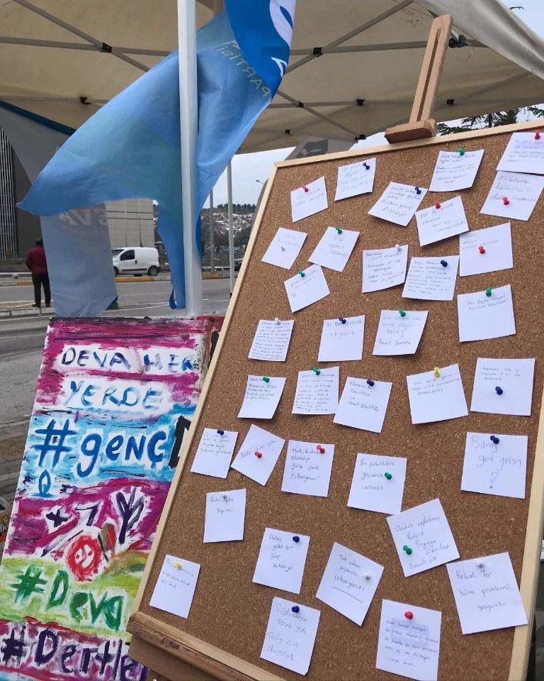 Konuyla ilgili bir açıklama yapan DEVA Partisi Kocaeli İl Gençlik Politikaları Başkanı Nihat Can Kırcı şu açıklamalarda bulundu, “Kocaeli Üniversitesi’nde gençlerimize tatlı ve içecek ikramında bulunduk. Gençlik broşürlerimizi dağıttık. Kardeşlerimizin dertlerini ve isteklerini dinledik. Aynı zamanda ‘Gençlik Yazıyor’ isimli etkinliğimizde üniversite gençlerinden sorunlarını ve gelecekle ilgili kaygılarını mantar panomuza kağıtlarla yapıştırarak paylaşmalarını istedik. Ne yazık ki; ülkemizin geleceğine yönelik beklentiler ve şu anda ki durumuyla ilgili çok vahim şeyler yazılmıştı.