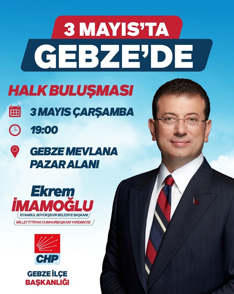 İmamoğlu, 3 Mayıs Çarşamba Günü saat 19.00’da Gebze Mevlana Mahallesi Kapalı Pazar Alanı’nda Gebzeli seçmenlerle bir araya gelecek.
