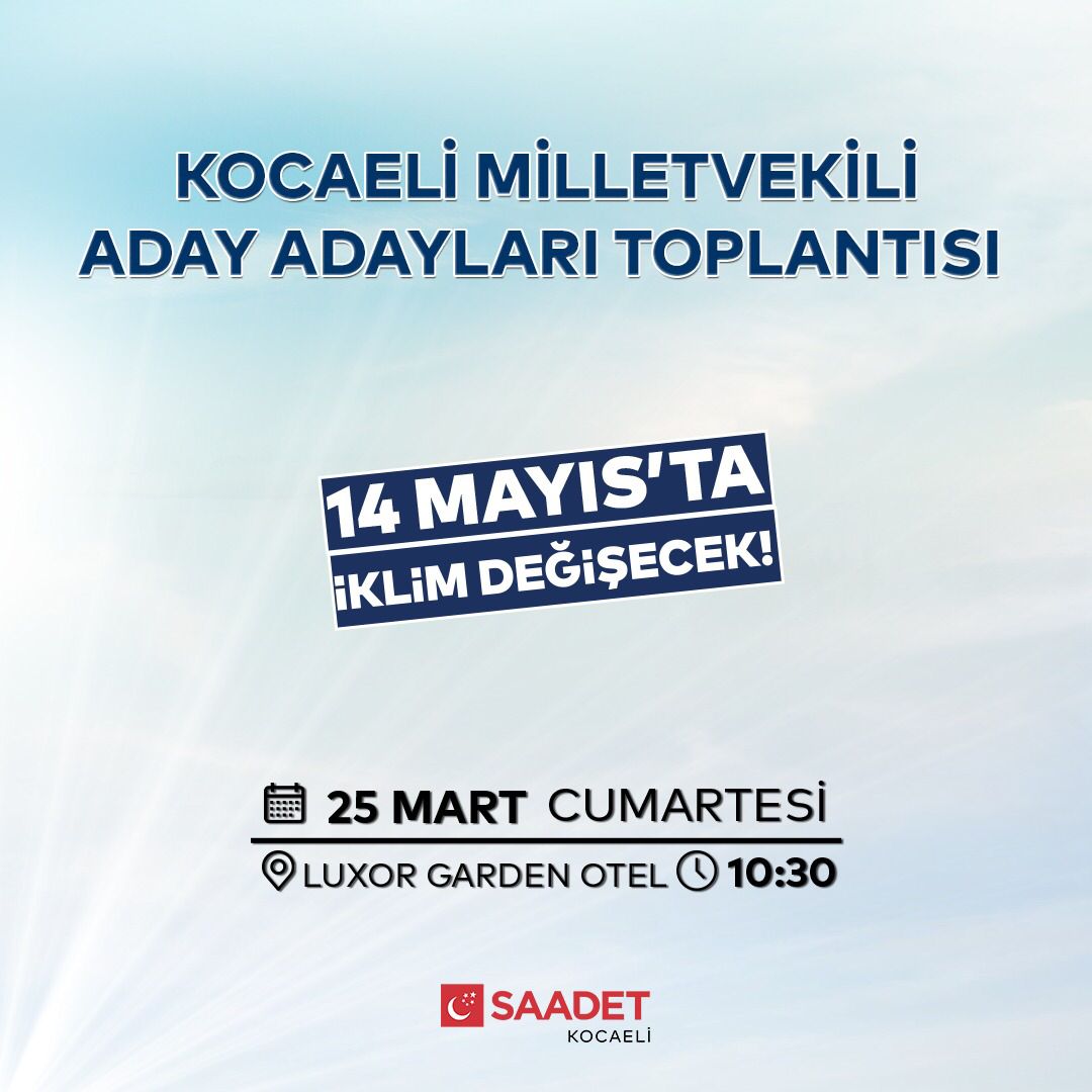 Saadet Partisi Kocaeli İl Başkanlığı, 14 Mayıs 2023'teki yapılacak 28. dönem milletvekili seçimleriyle ilgili aday adayı lansman töreni düzenleyecek.