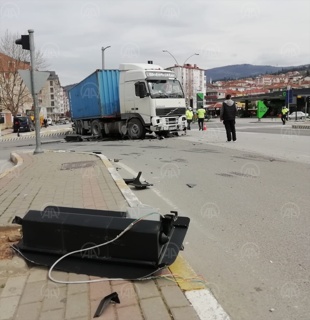 Kayacık Mahallesi kavşağında T.Ş. (36) idaresindeki 14 KF 421 plakalı tır, henüz belirlenemeyen nedenle kaldırımı aşıp trafik ışıklarına çarptı.